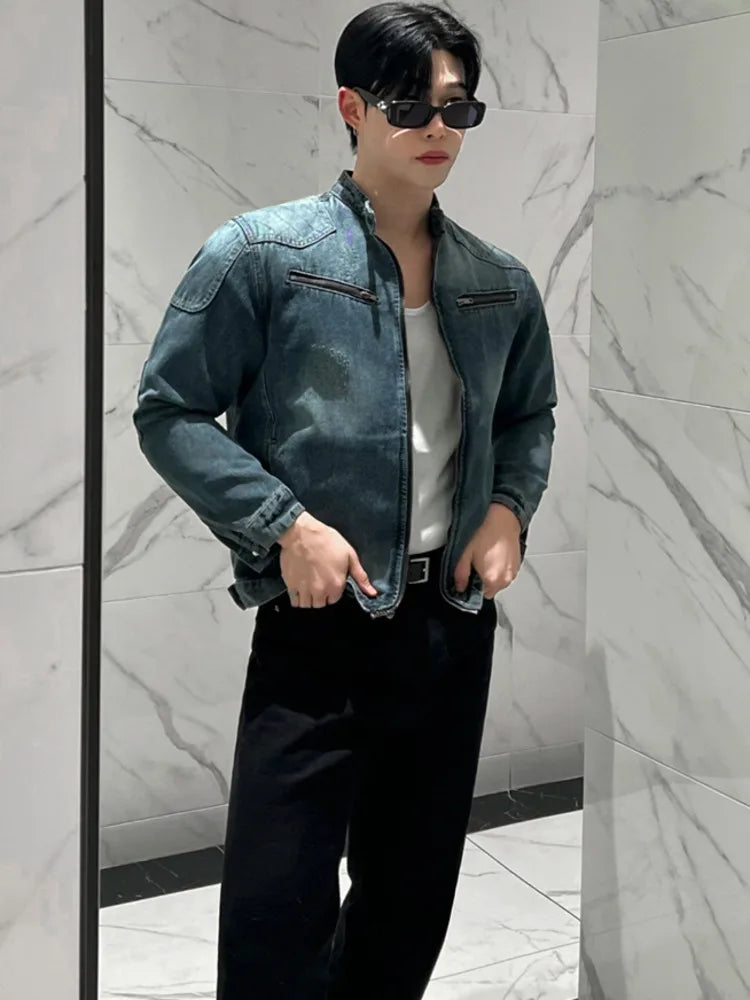 SYUHGFA Korean Style High Street Men's Denim Jackets Stand Collar Zipper Loose Vintage Washed Male Short Coats Tide 2024 Autumn