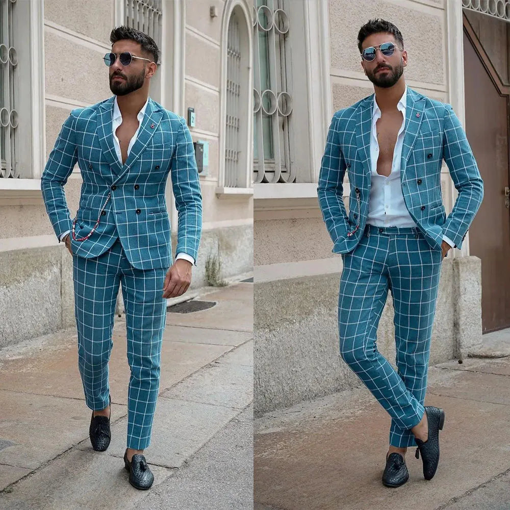 Plaid Men Suit Tailor-Made 2 Pieces Blue Blazer Pants Double Breasted Slim Fit Formal Business Causal Party Host Customized