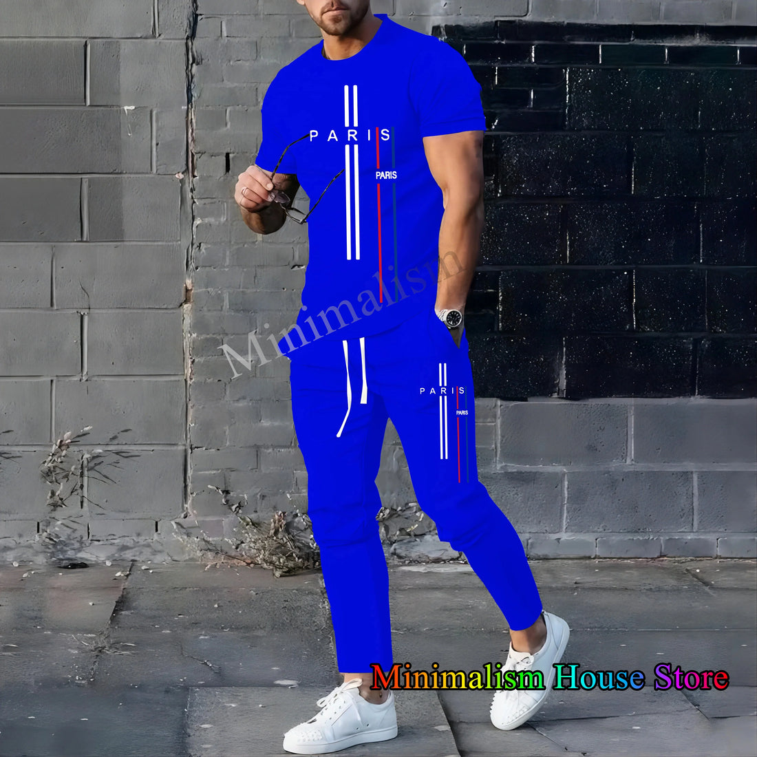Summer Sportwear Suit Solid Color Short Sleeve T Shirt Long Pants Sets Men Tracksuit Paris Print Casual Sports Oversize Clothes
