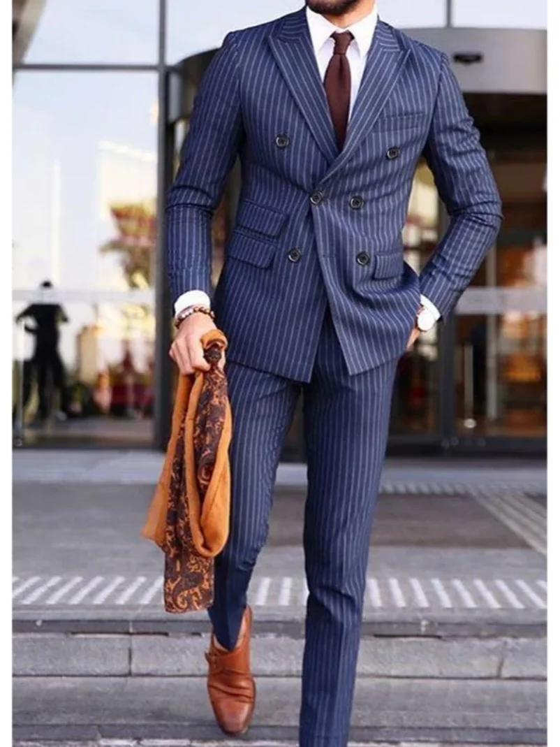2 PieceLuxury Men Suits Blue Stripe Double Breasted Peak Lapel Regular Length Formal Office Male Clothing Slim Fit Jacket Pants