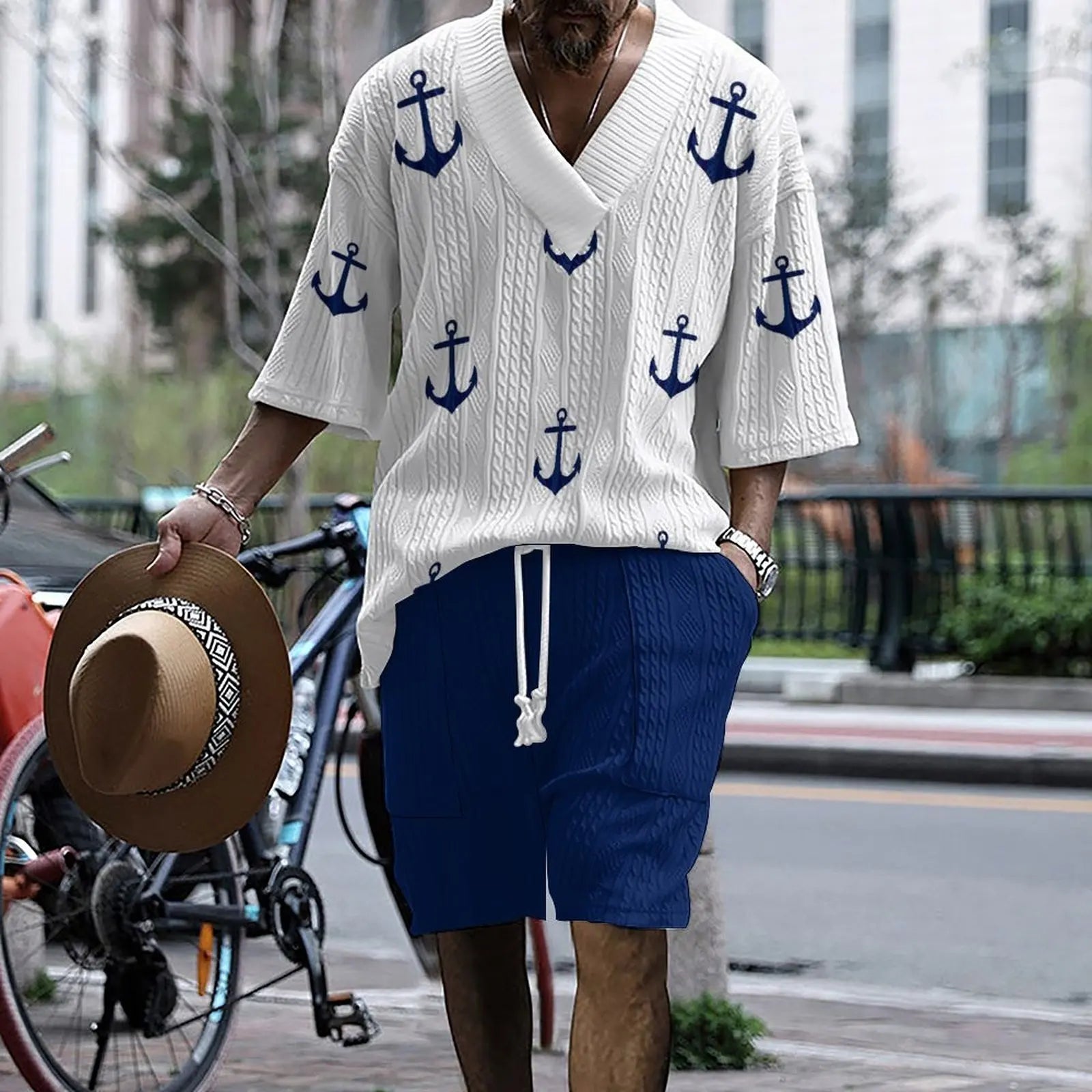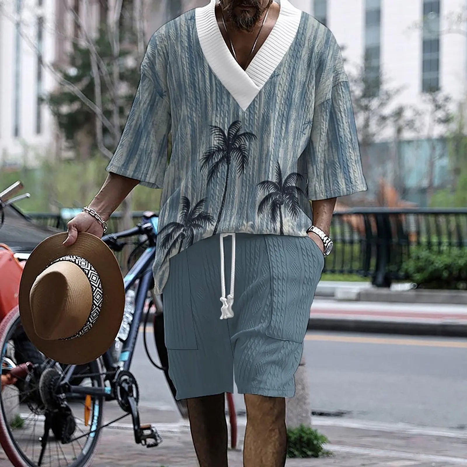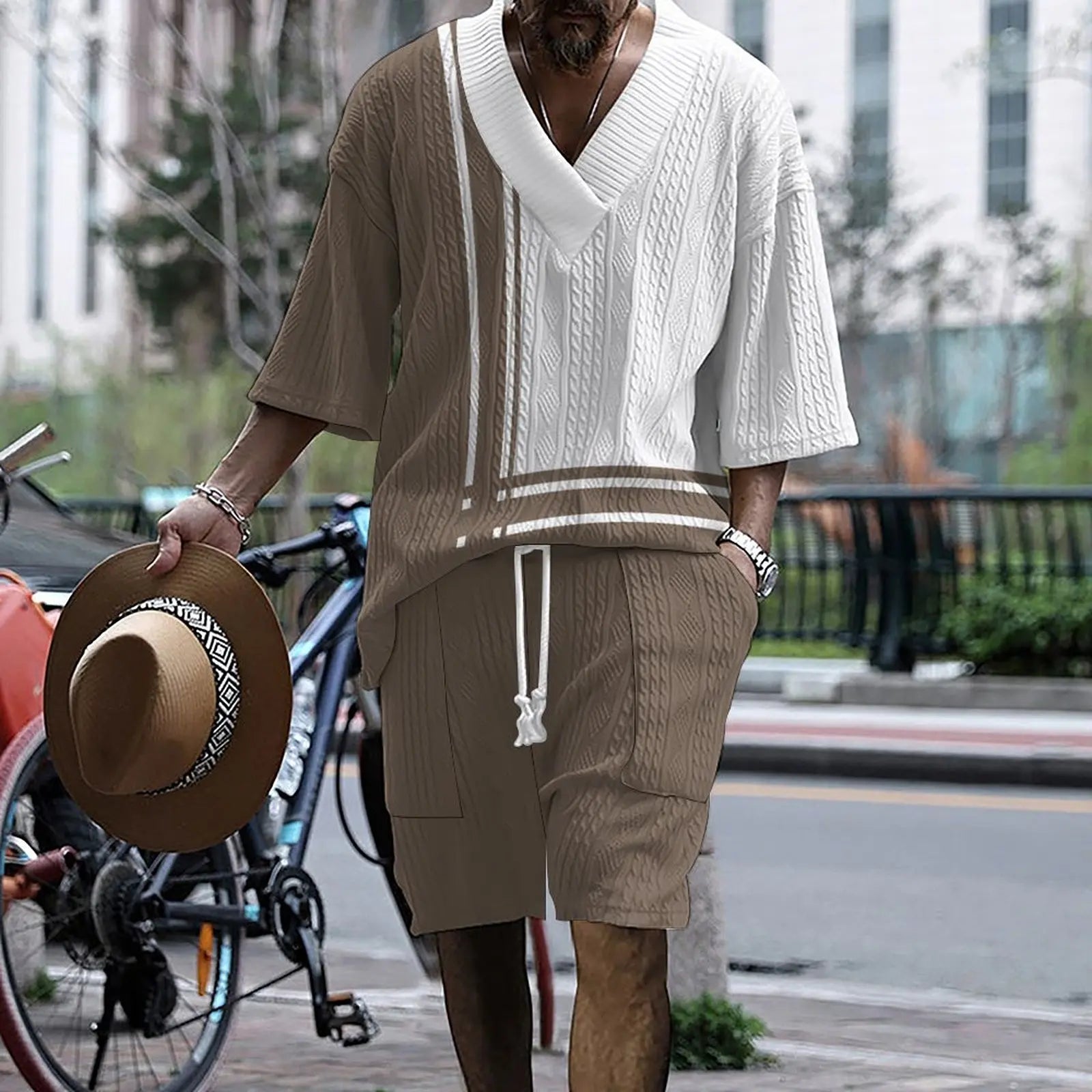 2024 New Summer Men's Set Loose Casual Sports Suit High-quality Jacquard V-neck Short-sleeved Shorts Two-piece Men's Clothing