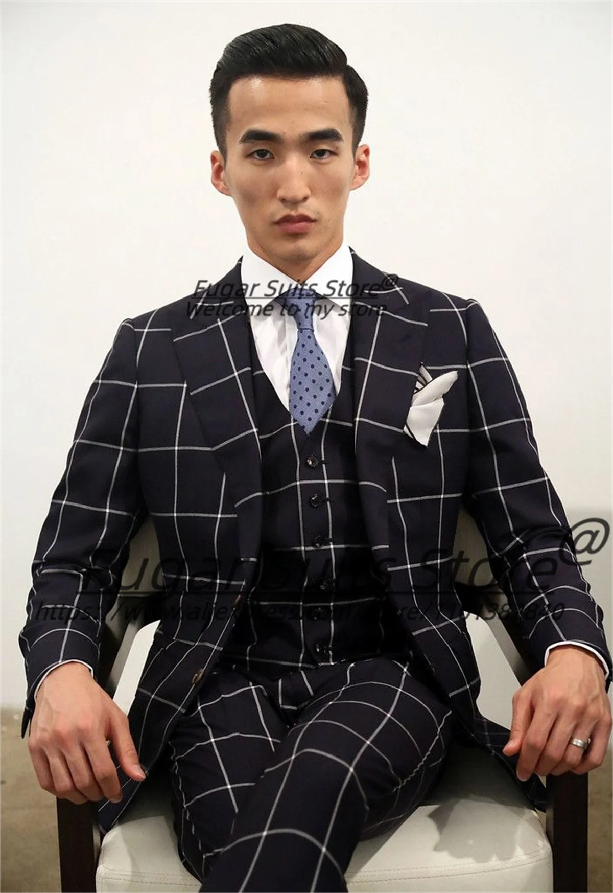Business Black Plaid Men Suits Office Work Male Blazers Slim Fit Peak Lapel Groom Tuxedos 3 Pieces Sets Classic Costume Homme