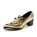 Large men's metal pointed gold rivet printed striped splicing high-heeled leather shoes club party leather formal shoes