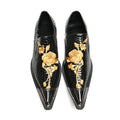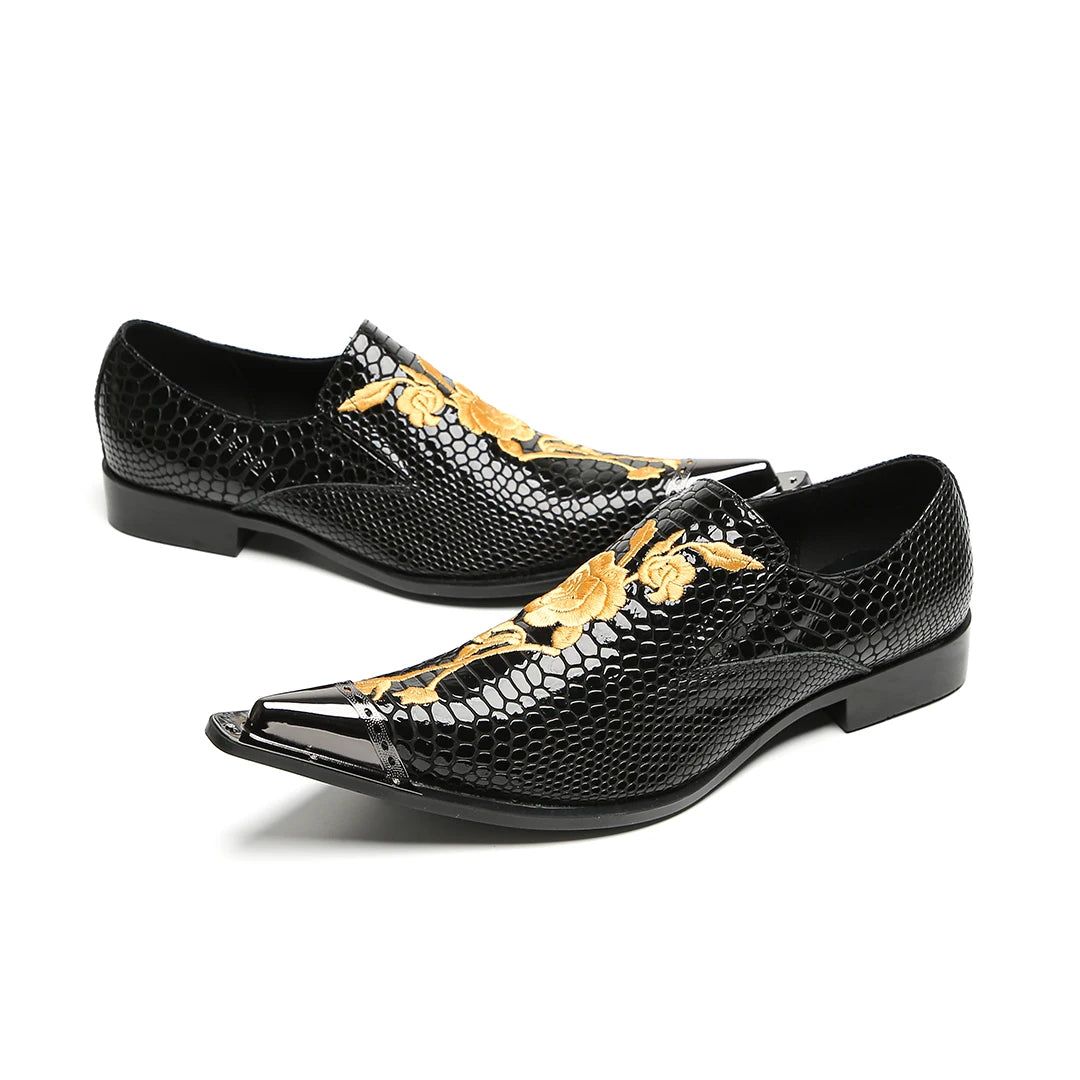 Men's black embroidered floral leather shoes with metal toe caps mid-heels genuine leather uppers and formal party shoes