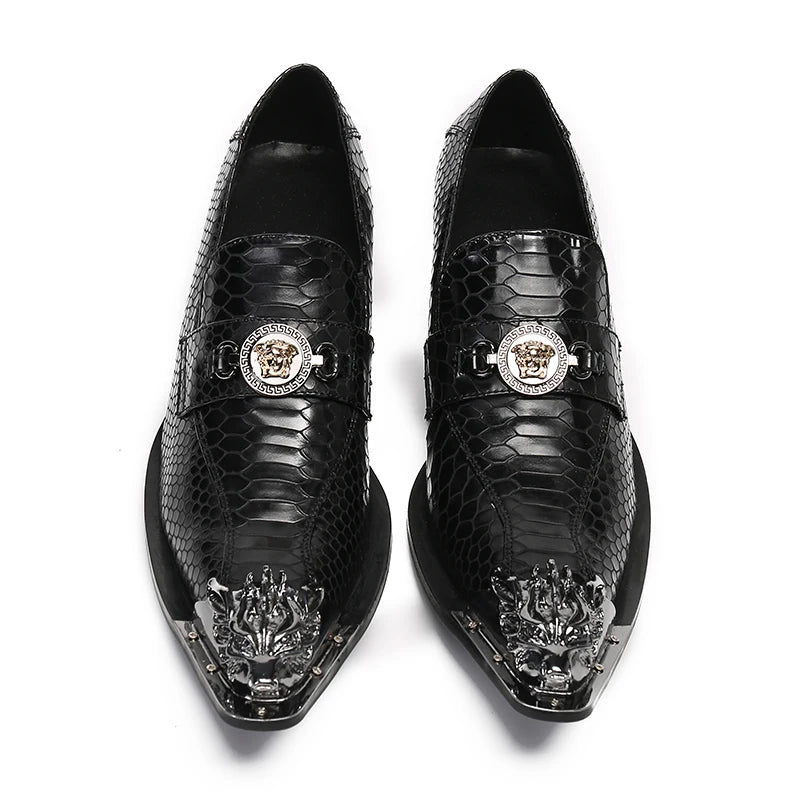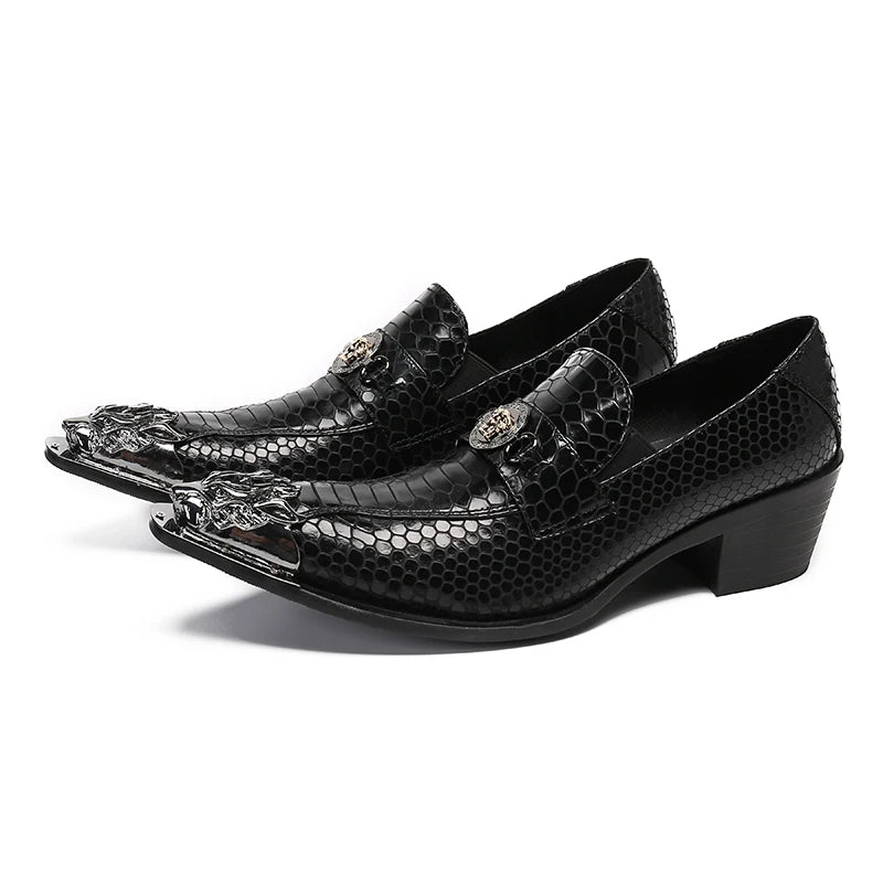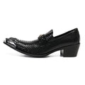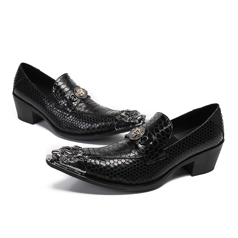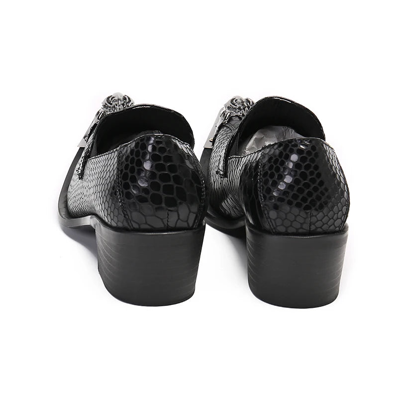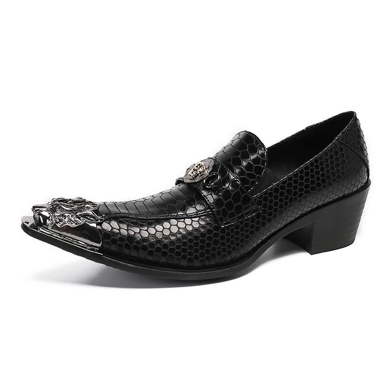 Men's Black Leather Dress Shoes with Snake Pattern Solid Toe High Heel Business Shoes for Office Wear