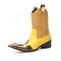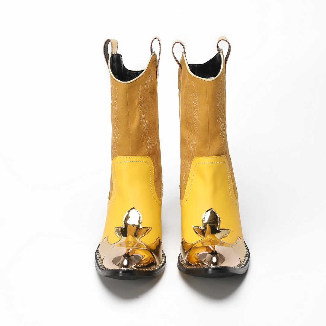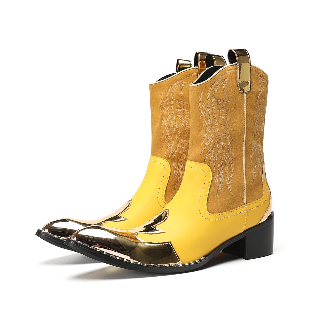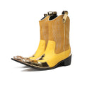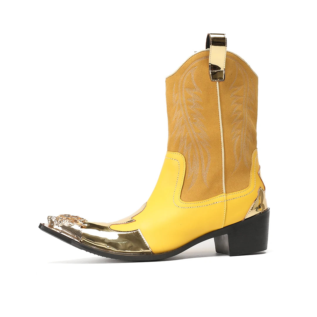 New Men's Yellow Embroidered Metal-Toe Genuine Leather Boots with Side Zipper Patchwork Short Punk Biker Boots for Parties