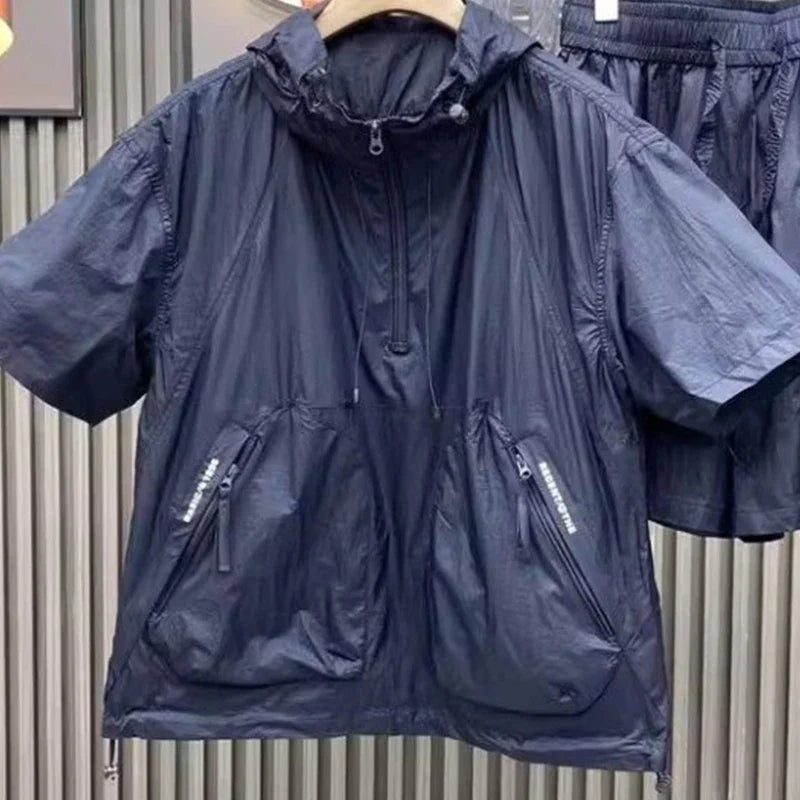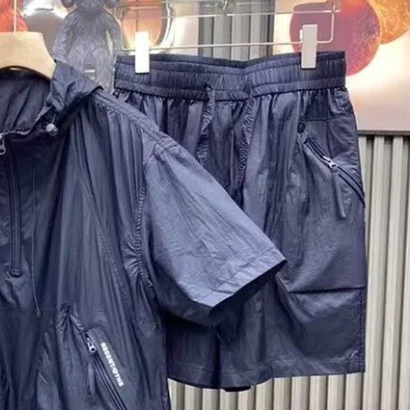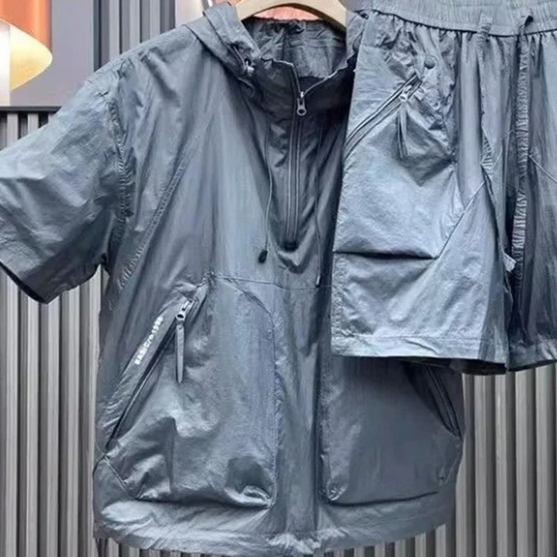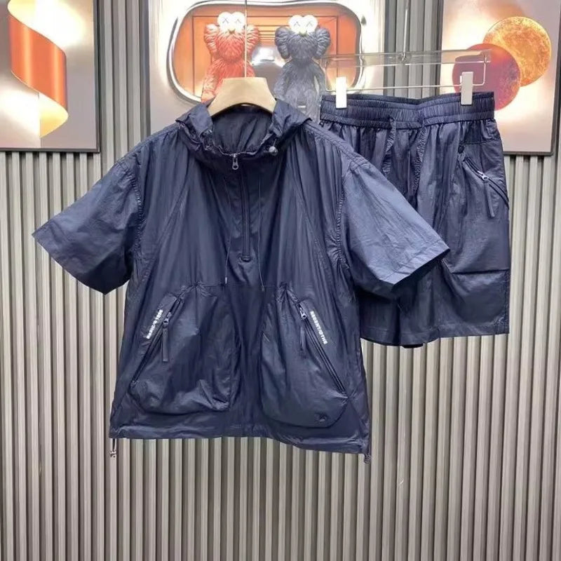 Summer Men's Hooded Lightweight Short-sleeved Suit Loose Ultra-thin Breathable Jacket Shorts Two-piece Couple Suit Men Urban