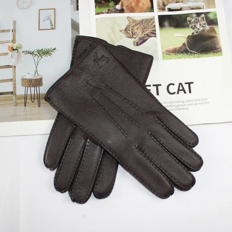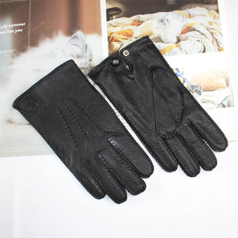 Touch Screen New Men's Deerskin Gloves Leather Fashion Corrugated Wool Knit Lining Winter Warm Driving Gloves Autumn