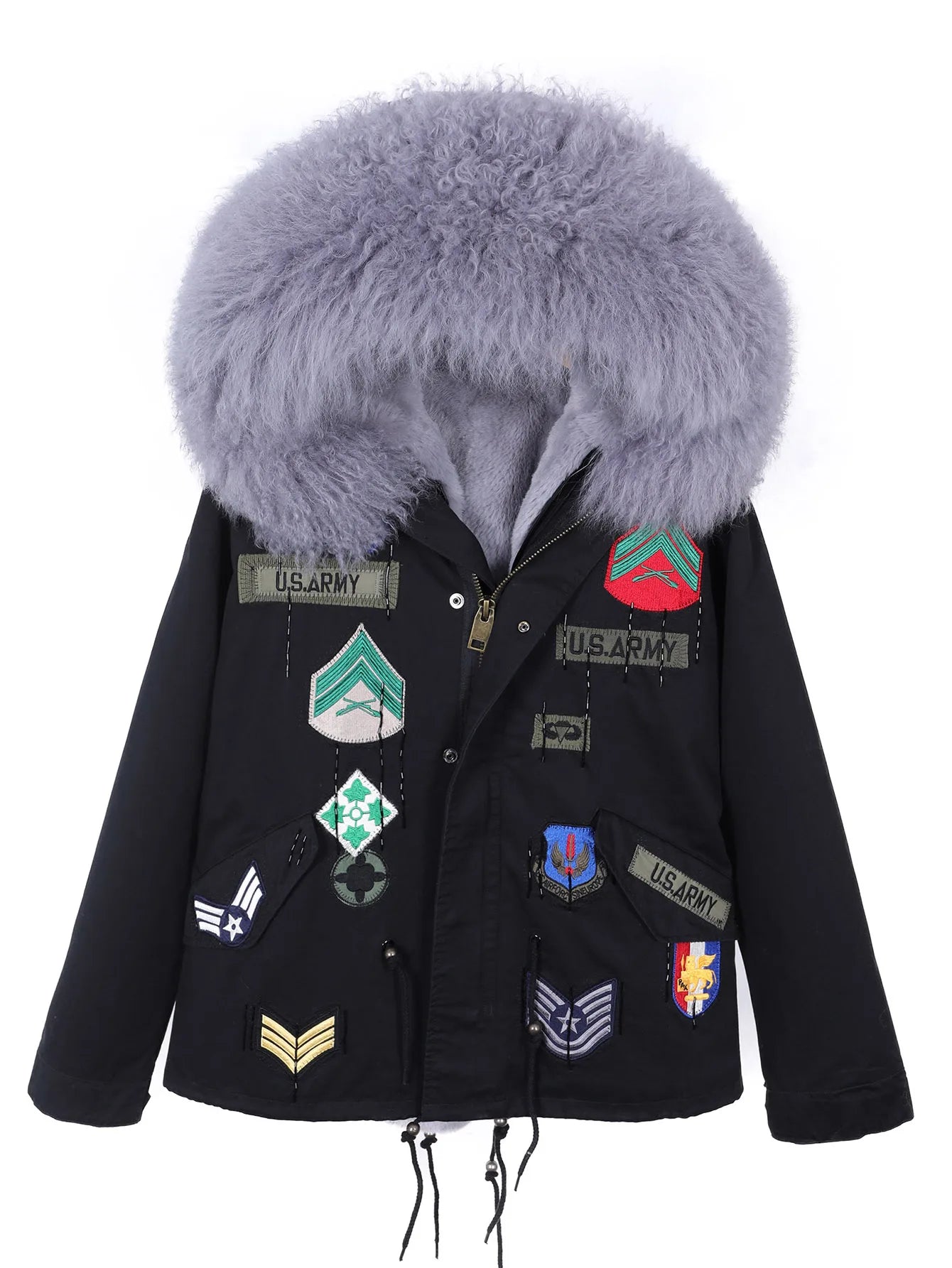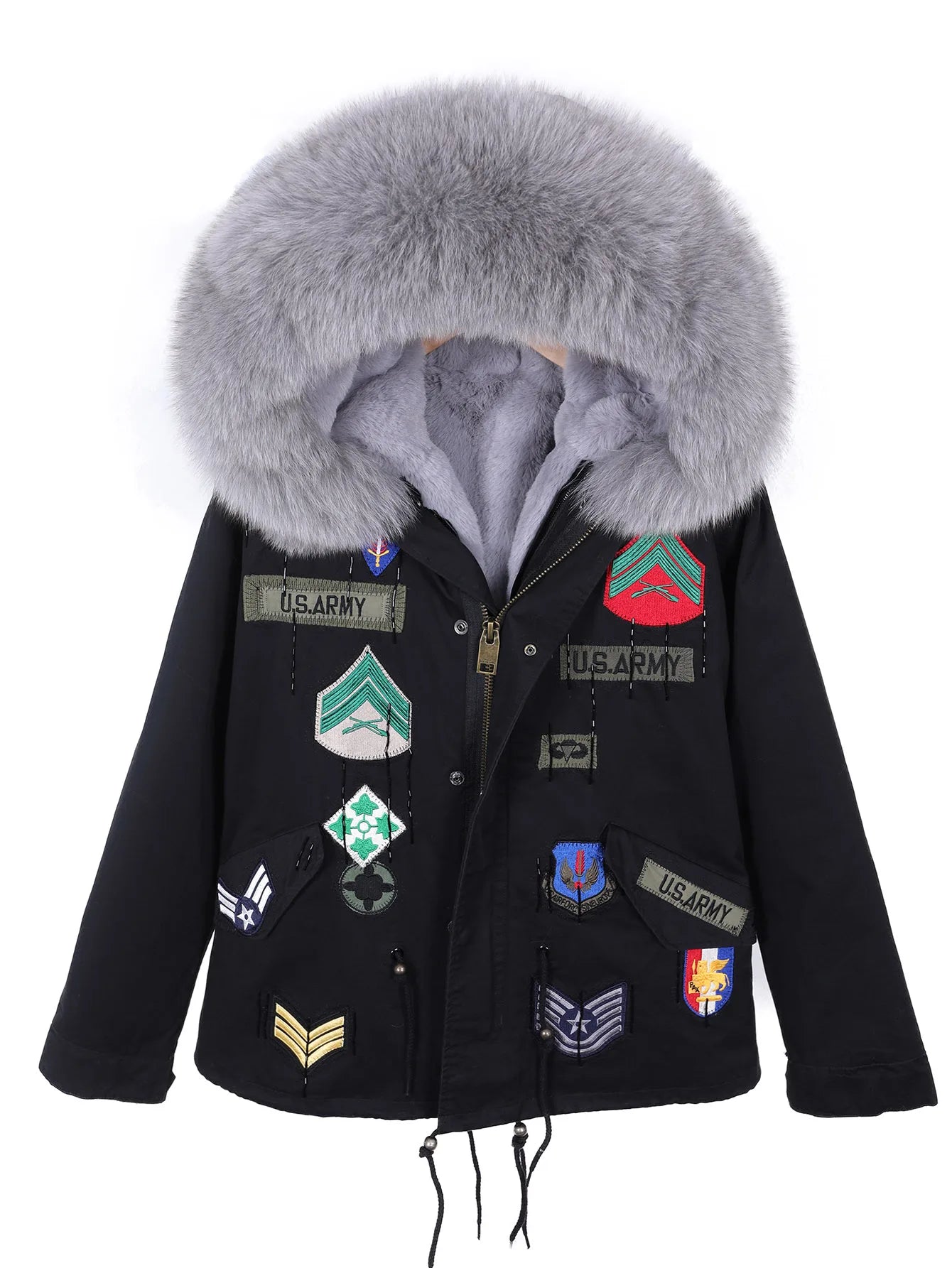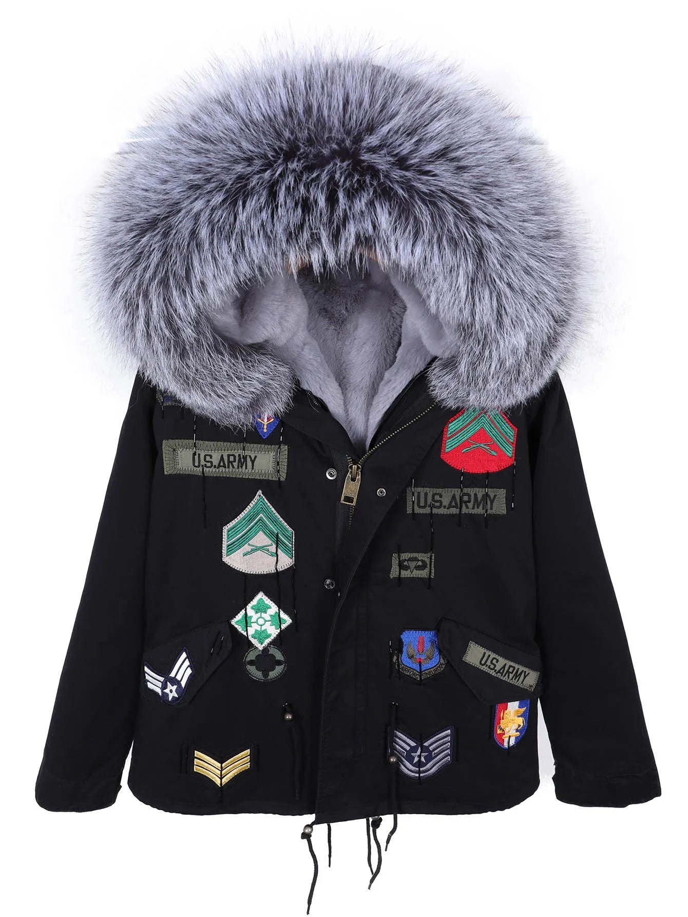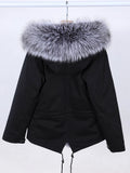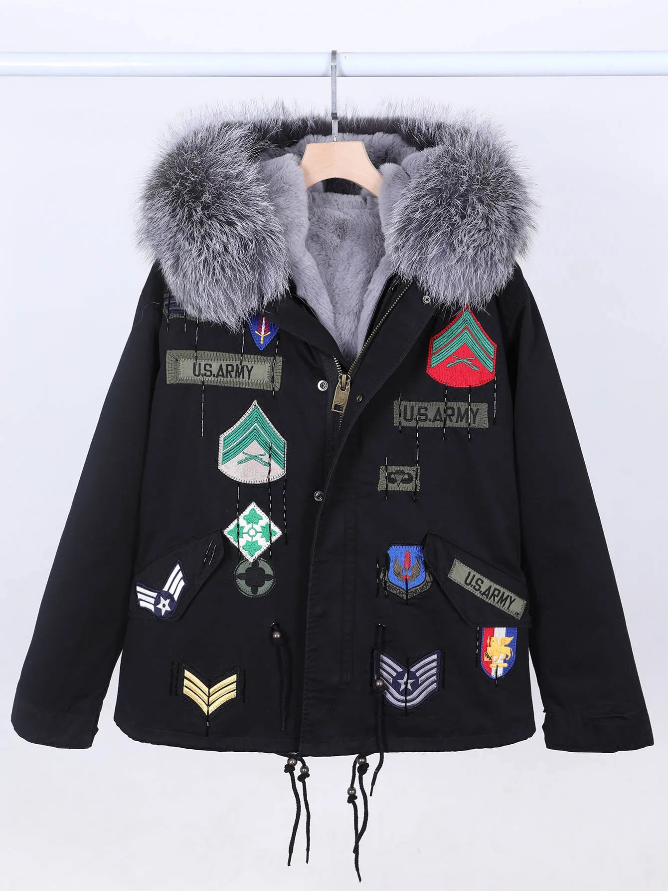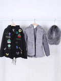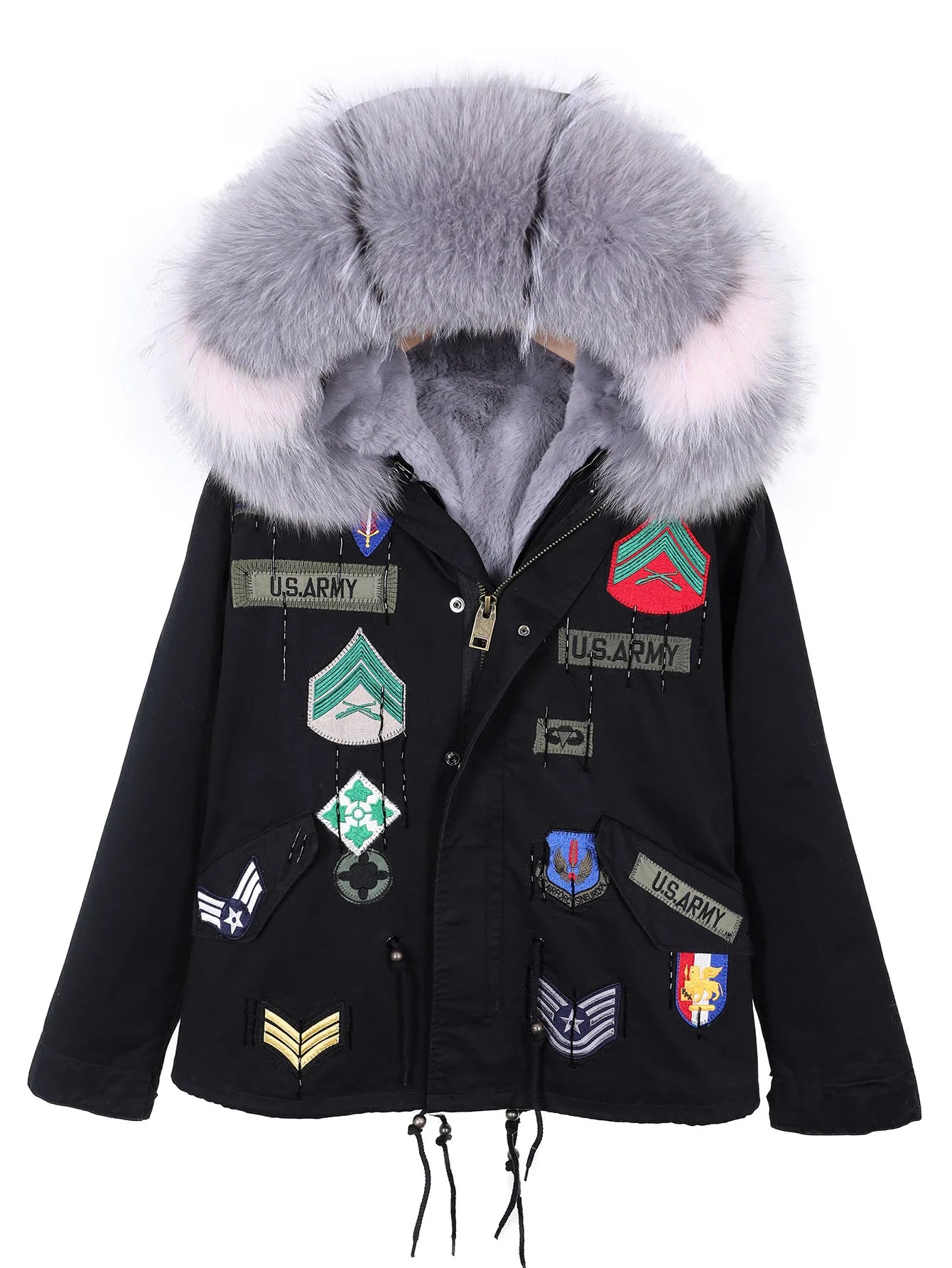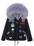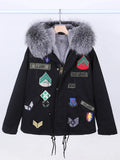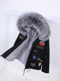 Winter Women's Embroidered Black Parka Coat Warm Natural Fur Collar Women's Jacket Outerwear