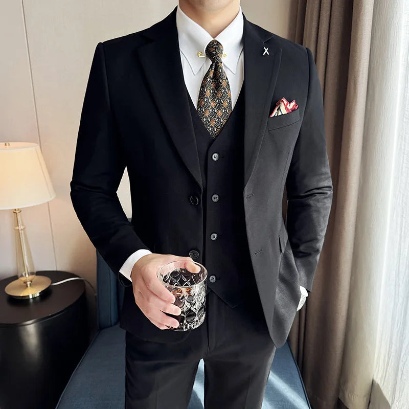 Wool 6% (Jakcet + Vest + Pants ) High-end Brand Mens Solid Color Leisure Business Suit 3Pcs Sets Groom Wedding Dress Party Suit